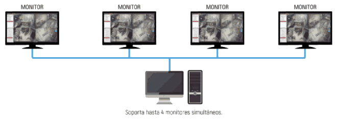 Soporta hasta 4 monitores (con 64 video simultáneos de cámaras).