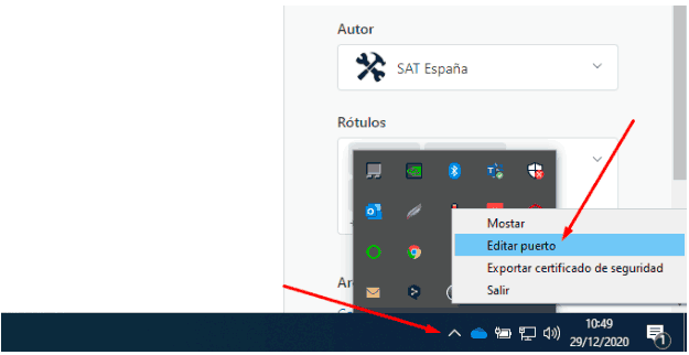La solución es modificar el puerto que usa el servicio del Safire Control Center y luego modificarlo al iniciar el programa. Para ello, al ejecutar el SCC, hay que ir al icono del programa dentro de la barra de iconos ocultos; ahí, pulsando el botón derecho del ratón, accederemos a la opción Editar puerto: