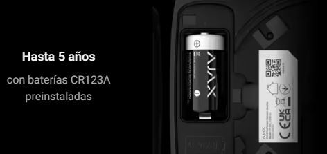 El dispositivo ofrece hasta 5 años de autonomía mediante baterías CR123A preinstaladas y sustituibles sin herramientas, y permite el control y configuración remota desde la app Ajax.