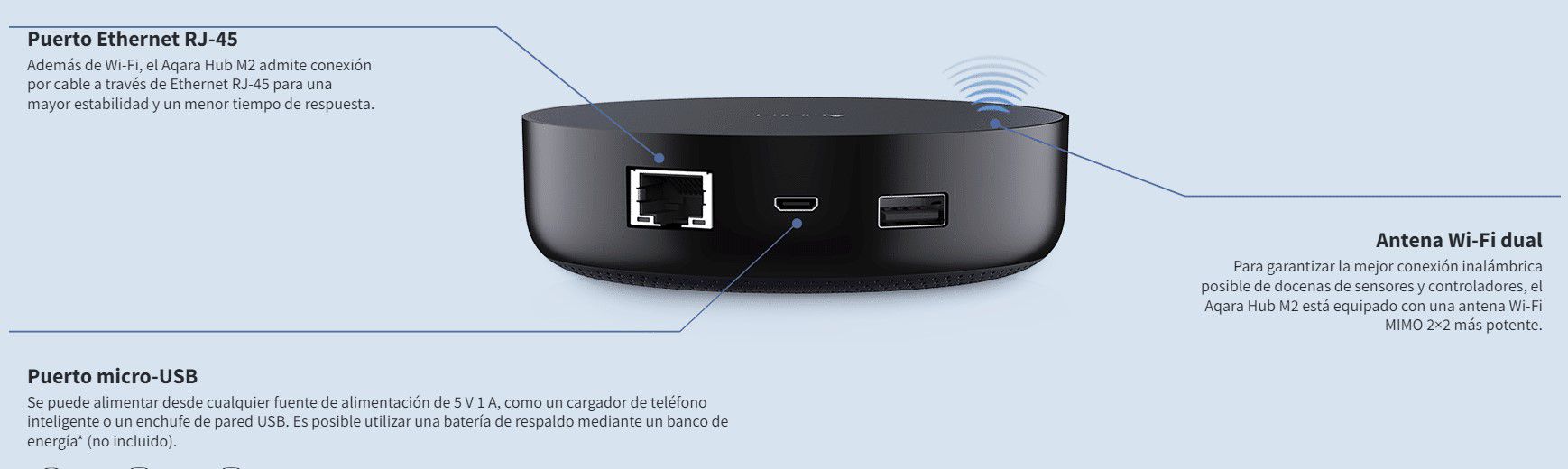 El AQARA HUB M2 cuenta con una entrada LAN para conexión directa a internet mediante cable Ethernet, lo que mejora la estabilidad y la velocidad de respuesta de todo el sistema.