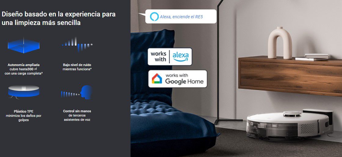También detecta automáticamente las alfombras y aumenta su potencia de succión para una limpieza más profunda. Con una capacidad de limpieza de hasta 300 m², el EZVIZ RE5 puede cubrir eficazmente grandes áreas en una sola carga.