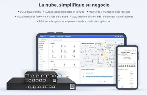 Su gestión en la nube gratuita de Ruijie permite autodescubrimiento y configuración remota de hasta 150 dispositivos (APs y switches NBS) más 128 switches ES, o hasta 500 dispositivos en modo AC.