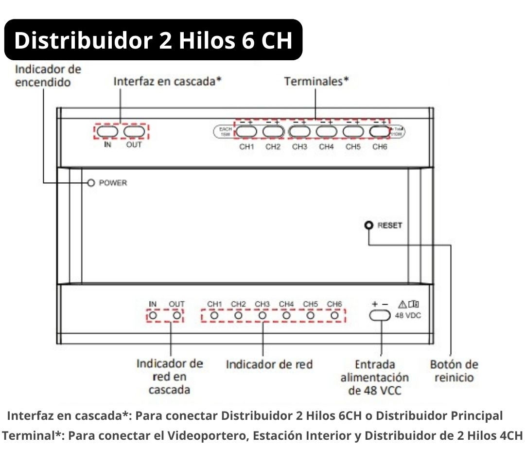 Admite la conexión en cascada de DISTRIBUIDOR 2 HILOS 6CH, lo que amplía la capacidad del sistema y permite una comunicación fluida entre múltiples edificios.