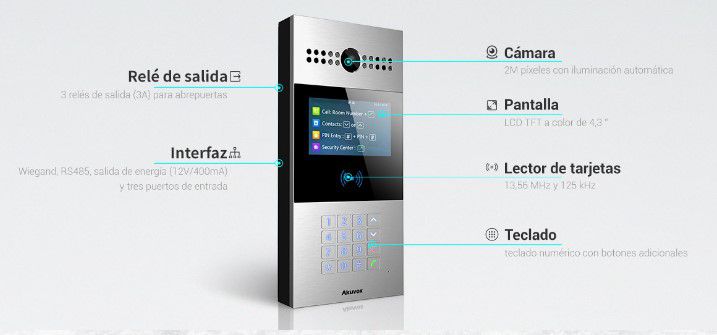 VIDEOPORTERO COMUNIDAD AKUVOX IP POE APERTURA TARJETAS EM /MF / PIN Sensor 2Mp LENTE GRAN ANGULAR AUDIO BIDIRECCIONAL SIP PANTALLA 4.3" VISION NOCTURNA RS485 SALIDAS RELES ACCESO REMOTO APP